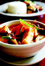 Spoon does just fine without broadcasting that it’s an off-campus hot spot day and night. The management had no problem with the Alumni Magazine staff taking photographs of the food but saw no need to come out of executive chef Aim Suteeluxnaporn’s busy kitchen to tout the eatery.