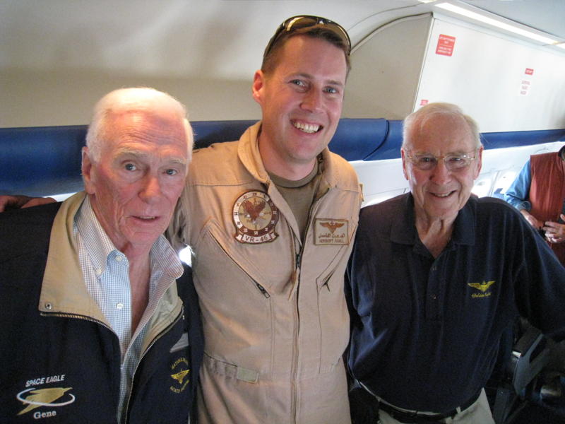 On March 9, I flew a U.S. Navy DC-9 aircraft into Doha, Qatar, to pick up passengers to take to Muscat, Oman. It wasn’t until I arrived in Doha and the passengers started to board the aircraft that I realized it was going to be a very special mission. I was flying the “Legends of Aerospace” — astronauts Neil Armstrong, the first man on the moon; Gene Cernan, the last man on the moon; and Jim Lovell, the Apollo 13 commander, with panel host David Hartman, the former Good Morning America host. I flew them to Muscat, where carrier airborne aircraft, C-2s, were waiting to take them out to USS Eisenhower.