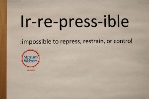 Someone printed the definition of irrepressible — impossible to restrain or control — and taped it to his office door.