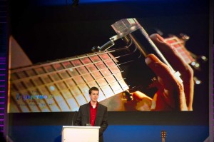 One of the last presenters was Daniel Chaney, an industrial design major. Chaney stepped onto the stage with Brooks Tellekamp, an electrical engineering major. As Chaney spoke, Tellekamp began to play a guitar.