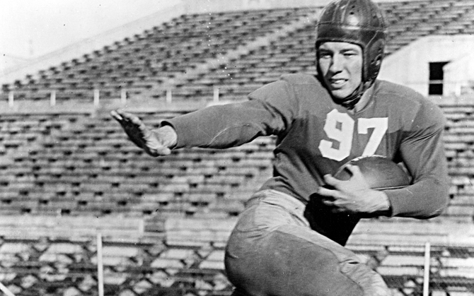 Navy tailback Al Cameron took the snap at the right hash mark and got himself into position to throw toward the end zone. Like most great athletes, Castleberry possessed a keen awareness of where the ball was at all times and this play was no exception. Recognizing the direction of Cameron’s pass, Castleberry broke for the ball, stepping in front of the Navy receiver at the five-yard line to snatch the pass from mid air at the last instant. Then the Jackrabbit’s magic took over.