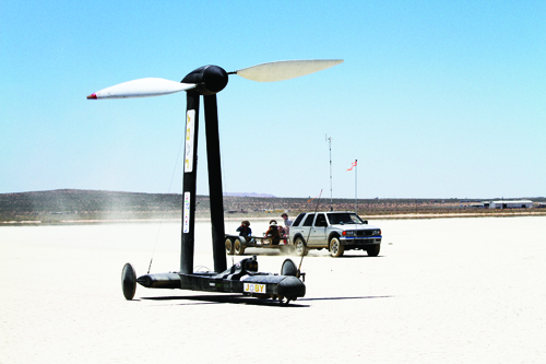 That March, Cavallaro and Borton took the Blackbird to the Mojave desert’s vast Ivanpah lakebed, home of the annual North American Land Sailing Association’s America’s Cup race, a site already vetted for the performance of dirt-boats and land-yachts. As Cavallaro strapped himself in for the day’s first run, he figured they’d need a few tries to get the gear ratios and prop pitches just right. With a small crowd watching at a distance, he settled into the Blackbird’s sling, released the hand-break and waited. The wind was blowing right around 15 miles per hour that day, cutting clear across the bare lakebed, hitting nothing but the gathered onlookers and the strange Frankenstein’s monster of a land craft.