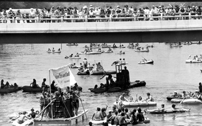 Imagine it: thousands of long-haired rafters, armed with beer and more, floating downstream on homemade crafts, while hundreds of thousands more gawked from the riverbanks.