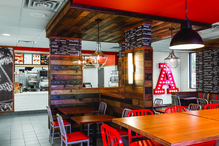 A little over a year from when the brand book was created, Arby’s has an updated logo, a new marketing campaign, and 35 restaurants have been renovated or newly built under the new brand vision parameters, with more to follow suit this year. In addition to the restaurant building designs, Arby’s guests will begin to see new uniforms on staff, new higher-end food items launching this year, and they’ll experience the “frontline concept.” This is an integrated counter space that is probably most similar to Jimmy John’s. Customers order at one end, watch as their food is assembled in clear view, then pick their orders up at the other end.