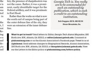 Inside the magazine, we made some structural changes to create a more logical flow. Campus news and sports coverage are paired together toward the front, while Alumni Association news is paired with class notes toward the back. A new section, “In the World,” covers the accomplishments of the Tech community far from campus. It includes “@Issue,” in which Tech leaders bring their great insights to bear on thorny topics facing the world. In this space, we ask, “What does Georgia Tech think?” a question that is central to the Institute’s new strategic vision.