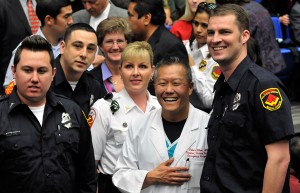 “Once I identified where my family was, the police came out and escorted us all to the front. When I walked into the arena, people started cheering and gave me a standing ovation. Again, I thought, this is just silly, you know, because I do this all the time — we coded somebody 30 minutes ago. But this was the first time that the community got the chance to thank people after the madness that had occurred a few days before,” Rhee says.