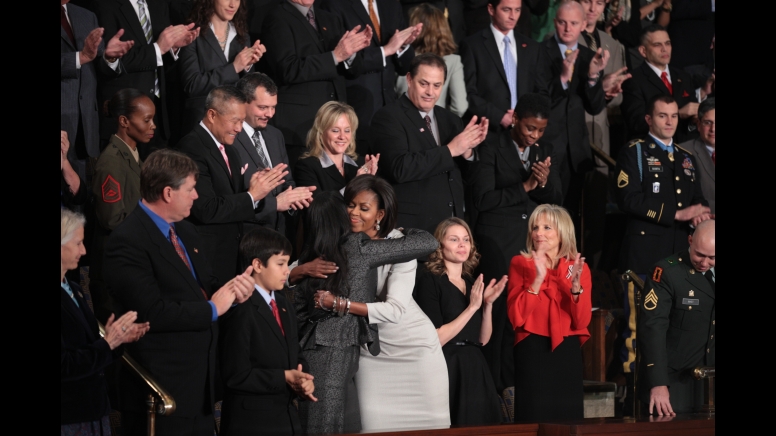 White House photo by Chuck Kennedy. Standing behind Michelle Obama during the State of the Union address in Washington, D.C., Peter Rhee applauds as the first lady hugs Christina Taylor Green’s mother, Roxanna.