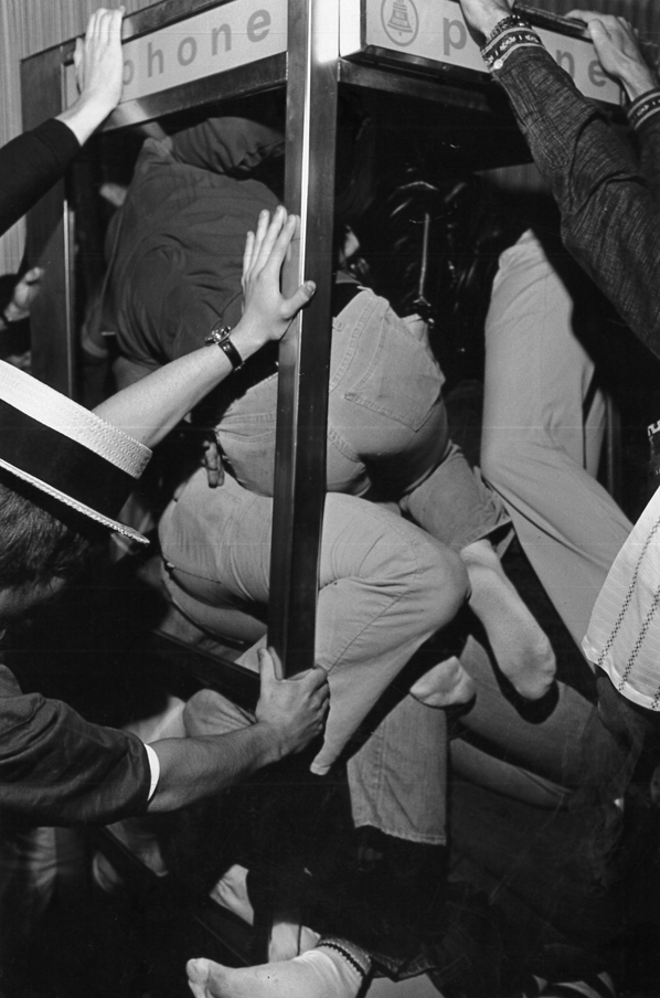 Thirteen Tech students with a combined weight of 2,200 pounds won the phone booth stuffing competition staged in March 1977 as part of a campus celebration of George P. Burdell’s birthday. The birthday party, which was sponsored by the Co-op Club, also featured paper airplane flying, cigar smoking and root beer chugging contests. Readers who recognize their rear ends or socked feet are invited to tell us their phone booth stuffing strategy by e-mailing [email protected].
