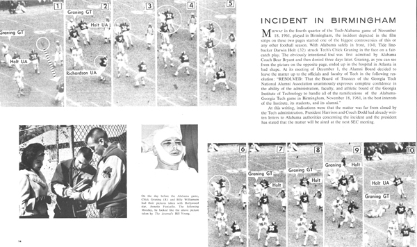 Most sources, including the Georgia Tech Alumnus, agreed the Yellow Jackets’ Chick Graning had been the victim of a deliberate cheap shot in a 1961 game against Alabama. Although there was bad blood between Georgia Tech and Alabama afterward, coach Bobby Dodd cited the 140 scholarship rule as his reason for wanting to leave the conference.