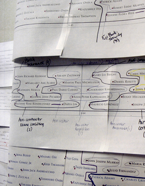The complexity of listing the 2,983 names proved impossible to do by hand. Arad enlisted a software artist to create the arrangement. One algorithm created clusters of names based on requests, which built what looked like puzzle pieces. A second algorithm then determined placements for those clusters on the 76 bronze panels that surround each reflecting pool.