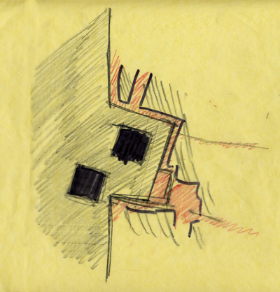 Arad sat down and began to sketch on a yellow piece of paper. Rough lines marked the riverbank, and light shading marked the water. And there, in the river, two squares, perfectly black. Twin voids.