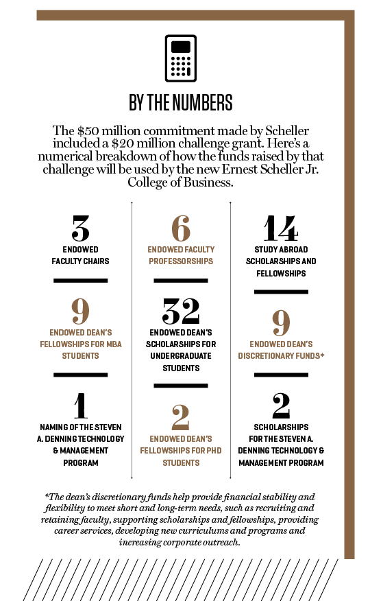 It is transformational in both size and intent: Scheller has earmarked the funds not for a new building or renovations, but to be invested in people—in endowed chairs, professorships, undergraduate scholarships and graduate fellowships. Quite appropriately, the college has been renamed in his honor; it’s now the Ernest Scheller Jr. College of Business.