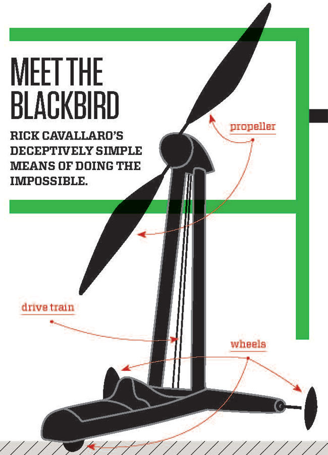 Rick Cavallaro had already figuratively poured himself into the Blackbird, but when it came time to test the craft in early 2010, he literally fitted himself into the vehicle. Its parts were the same as the tabletop test models just bigger, the design now including a just-barely man-sized sling into which Cavallaro situated his body, a bit like a luger, in order to steer and brake the craft and control the variable pitch propeller.