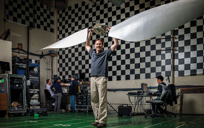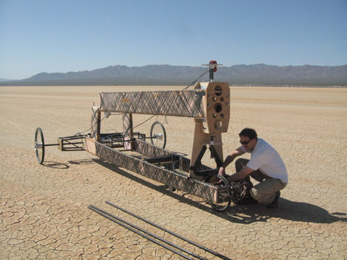 They mined some Silicon Valley contacts for help—Google and Joby Energy both signed on as sponsors—and in late 2009 found themselves with budget enough to fund the construction of a full-sized land-boat: 23 feet tall, 450 pounds, the propeller 17 feet tip to tip. The finished craft was a mish-mash of plywood, carbon fiber, bits of bicycles and go-kart parts—not exactly elegant, but it would work. Or so they hoped.