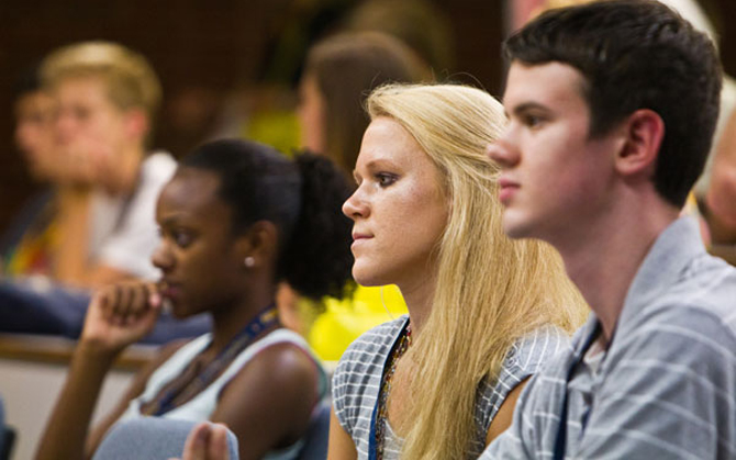 Above: Proctor, at center, attends a freshman orientation session in 2011.