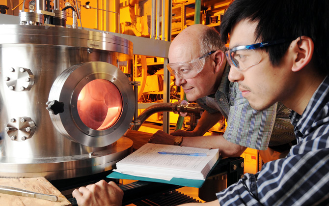 Above: Georgia Tech professor Dennis Hess and graduate research assistant Lester Li observe oxygen plasma treatment that exposes the cellulose nanofibrils on their superamphiphobic paper samples. Photo by Gary Meek.
