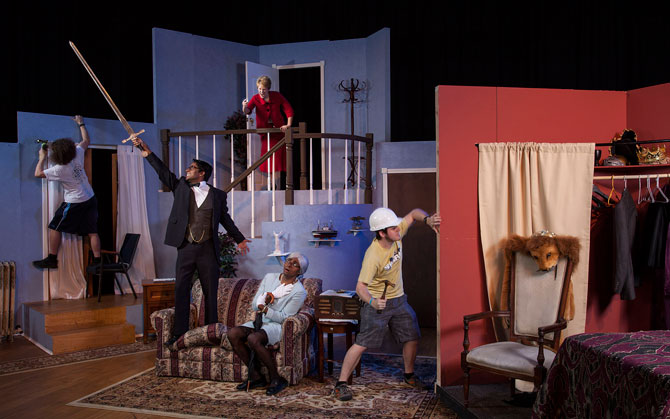 Set designer Josh Mysona, ChBE 13, seated nearby, looks up from his math homework. “That’s the opposite,” he notes, idly clutching a plastic prop sword.