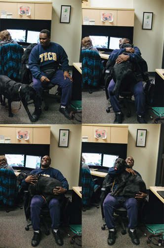 At 4:30, he eats his second meal of the day, din-din. If he’s asleep under my chair like he should be, at 4:25 he wakes up. Right on the clock. He gives me hell for five minutes—putting his head on my knee, up and down on my shin. Finally at 4:30 I say, “OK, you win!” Everybody in the lab starts laughing. I reach up and get his bowl and I have his food in Ziploc bags. He knows when it’s din-din time.