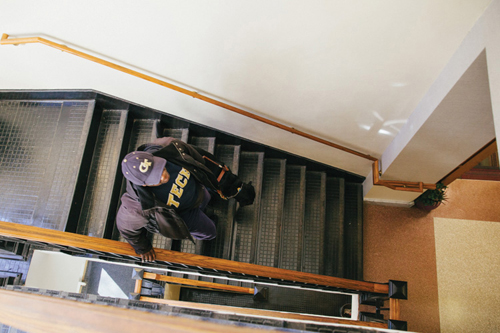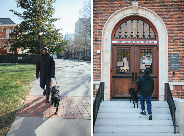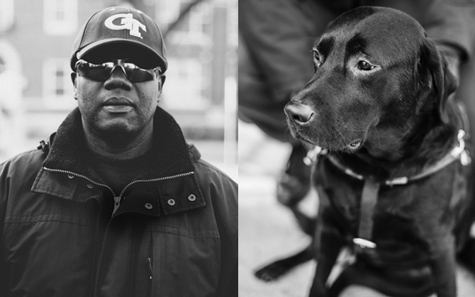 Blinded at 23 by a genetic eye disease, Vincent Martin—a former Paralympic track-and-field star, now a human-centered computing PhD student at Georgia Tech—at first relied on a cane to navigate his daily life. But, in 2011, he realized he needed more help. Enter Karson. Martin and his trained service dog are a symbiotic team: With the black Laborador helping guide the way, Martin moves through campus, between classes, labs, research sessions and workouts at the Campus Recreation Center on a rigorous schedule—one that also includes playtime, obedience training and lots of walking for Karson. Their day starts at 4:45 a.m. Just try to keep up.