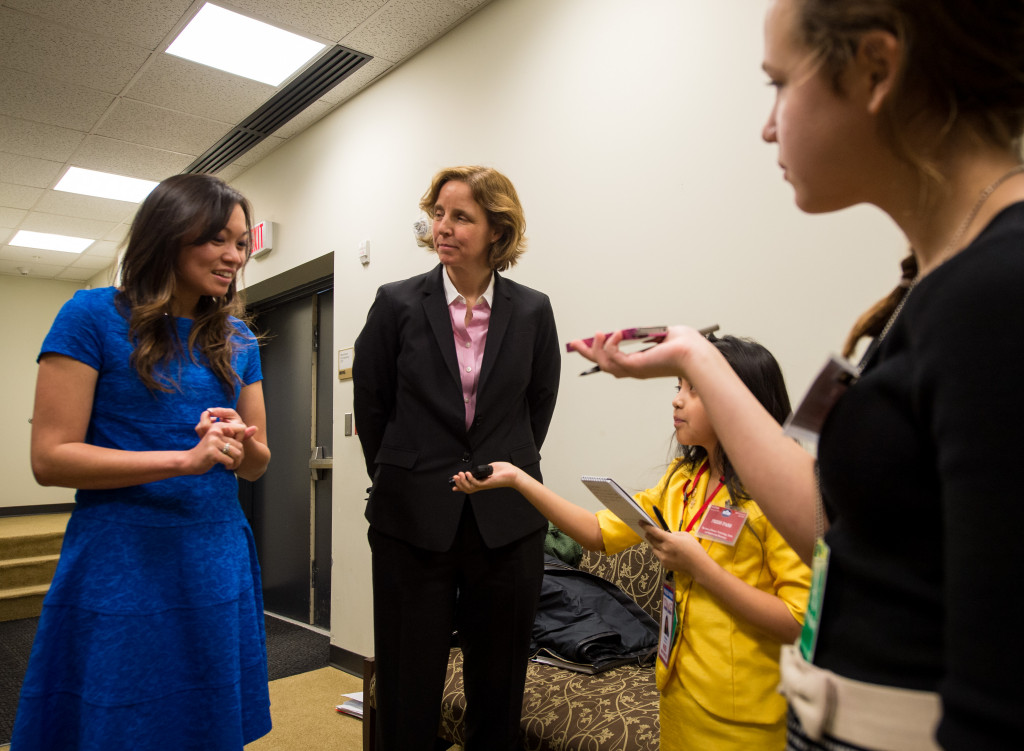 Kathy Pham of U.S. Digital Service, left, and United States Chief Technology Officer (CTO) Megan Smith answer questions from kid reporters prior to the annual White House State of Science, Technology, Engineering, and Math (SoSTEM) address, Wednesday, Jan. 21, 2015, in the South Court Auditorium in the Eisenhower Executive Office Building on the White House complex in Washington. Photo Credit: (NASA/Bill Ingalls)
