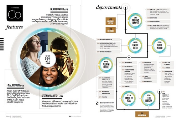 Meanwhile, Assistant Editor Rachael Maddux and I set out to create a new set of content for the magazine, as well as a new structure. We wanted a flexible framework that also created recurring spaces to accomplish the points listed above. That meant developing some new contents (“Talk of Tech,” “Innovate,” “Dollars and Sense,” “@Issue,” and “Tech History,” for example) as well as reconceptualizing existing contents such as “Ramblin’ Roll” and “Alumni House.”
